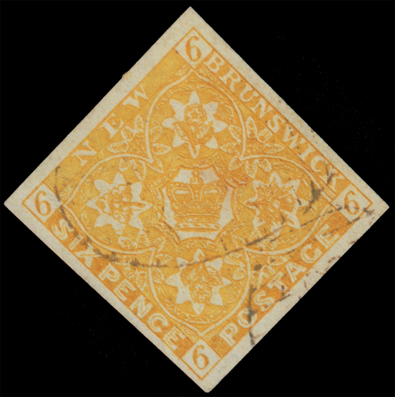 Nowy Brunszwik (New Brunswick) - I wydanie. Stemplowany znaczek za 6 pensów - korona i kwiaty heraldyczne, skasowany lekko odciśniętym stemplem numerowym.