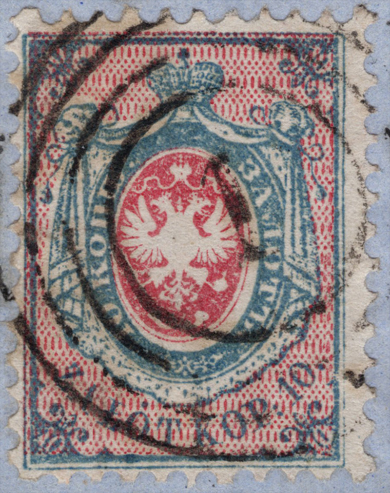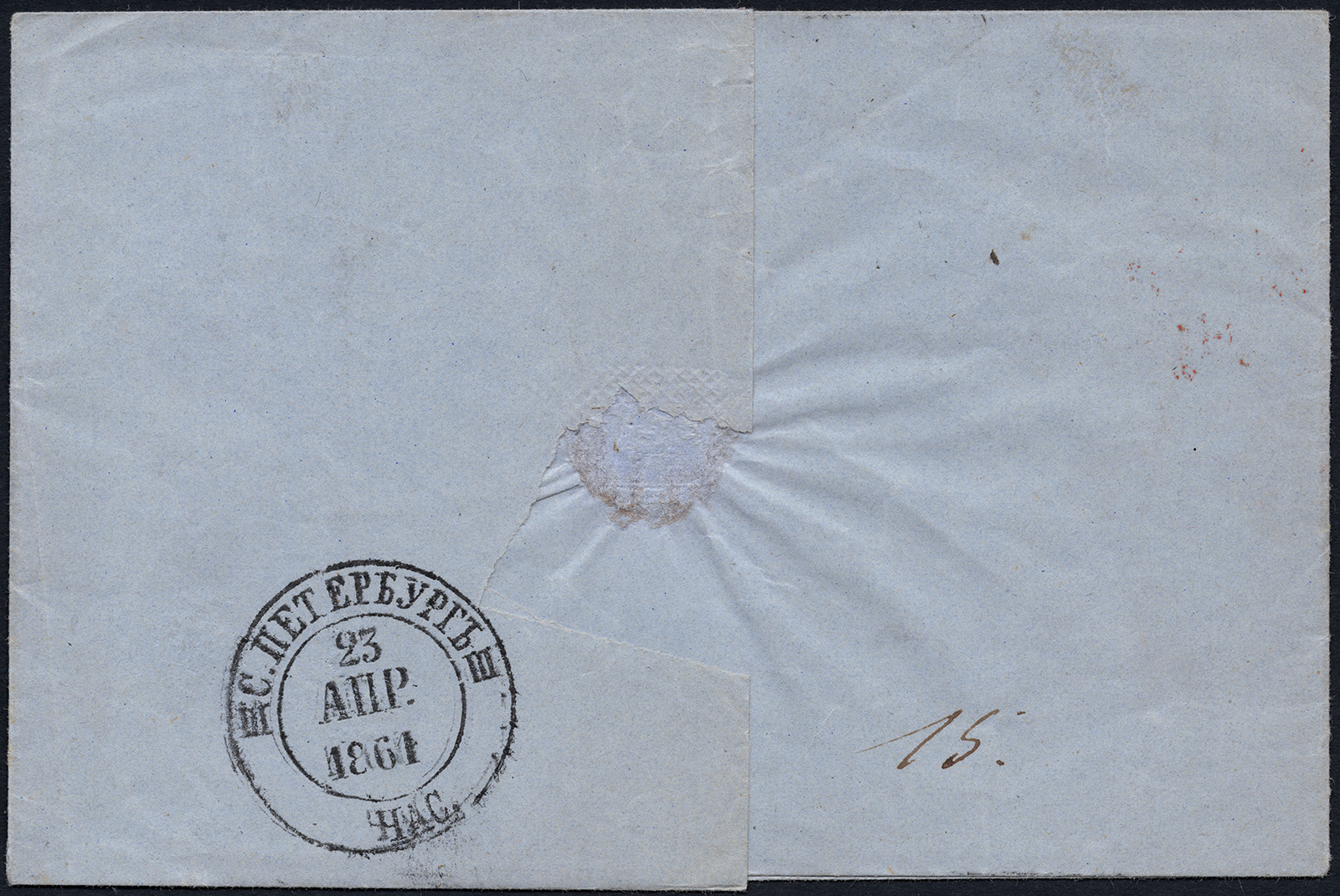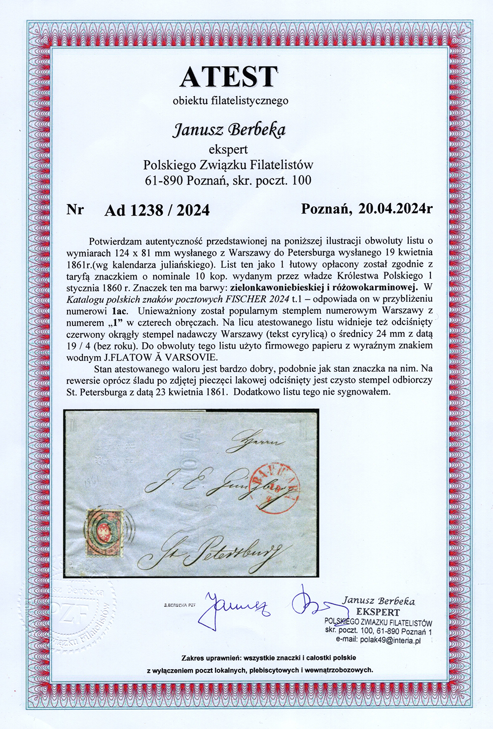 Królestwo Polskie. Koszulka listu wysłanego 1 maja z Warszawy do St.Petersburga, opłaconego pierwszym polskim znaczkiem za 10 kop. w kolorach zielonkawoniebieskim i różowokarminowym. Znaczek ma czyste żywe barwy, klarowny druk bez wyraźnych uszkodzeń żadnej z klisz. Czerwona klisza jest tylko minimalnie przesunięta względem niebieskiej i co rzadkie ma nieprzerywaną obwódkę wokół owalu. To według Z.Mikulskiego cechy tzw.pierwszego nakładu. Znaczek unieważniono polskim kasownikiem numerowym 1 - Warszawa w czterech okręgach. Po prawej rosyjskojęzyczny datownik nadawczy - ВАРШАВА 19/4, a na odwrocie rosyjkojęzyczny stempel odbiorczy St.Petersburga z dnia 23 kwietnia 1961 roku - obie daty w/g kalendarza juliańskiego. Fi. 8500.-.