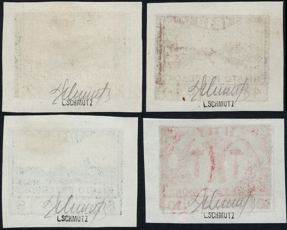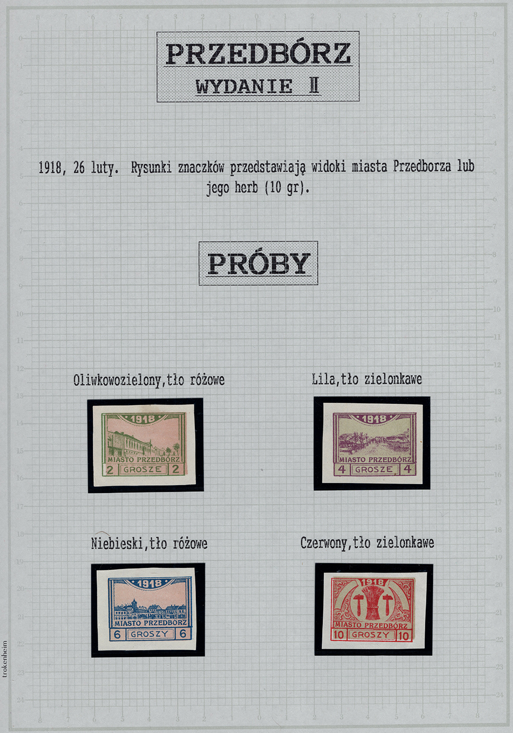 Przedbórz, II wydanie - Widoki miasta. Seria bardzo rzadkich prób o zmienionych kolorach tła. Próby za 2 gr. - niekatalogowana, i 6 gr. mają tło bladoróżowe zamiast zielonego. Próby za 6 gr. i 10 gr. tło zielone zamiast bladoróżowego. Kolejno według wartości 2 gr. to typ 1, 4 gr. to typ 2, 6 gr. to typ 1 a 10 gr. to typ 2. Są niegumowane tak jak je wydano. Świetna proweniencja, pochodzi z kolekcji zbudowanej przez wybitnego kolekcjonera znaczków i całości pocztowych Polski z lat 1860-1960 Krzysztofa Trokenheima.