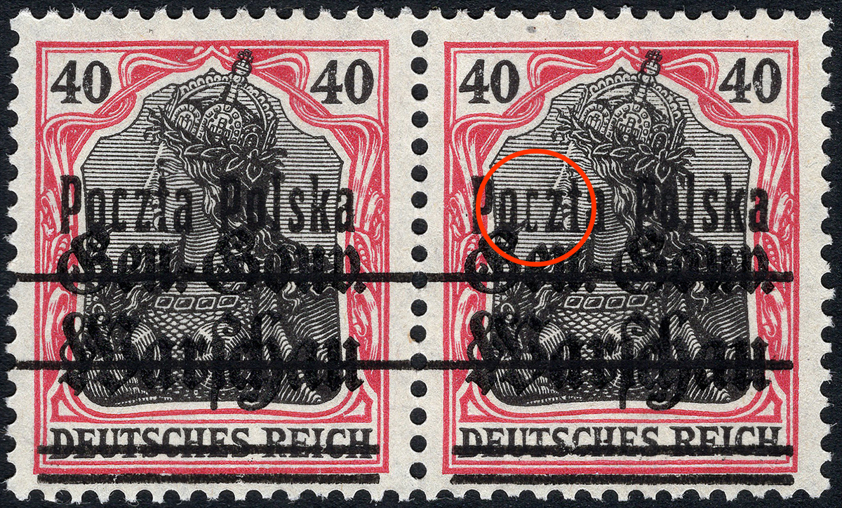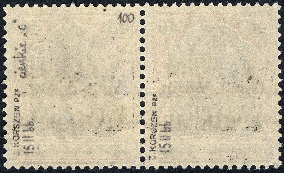 Wydanie przedrukowe PP/GGW. Parka znaczków za 40 f z nadrukiem II formą na srebrzystym nadruku GGW. Dodatkowo niekatalogowany błąd opisany przez Panów L.Schmutza i K.Sztabę na poz.100 "cienka lewa strona litery c w Poczta". Inne błędy na tym znaczku w parce Fi.540.-