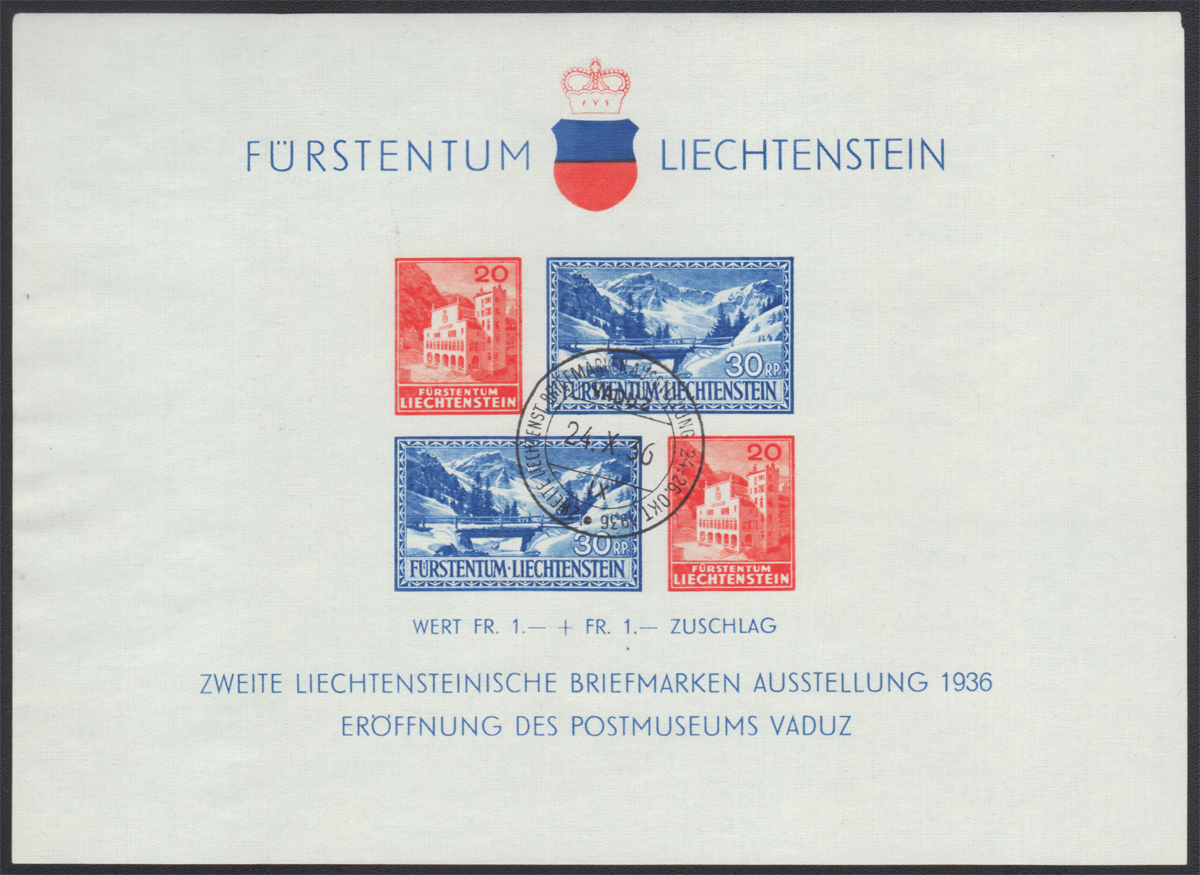 Liechtenstein - Otwarcie Muzeum Poczty i 2. Wystawa Filatelistyczna. Blok skasowany stemplem okolicznościowym w pierwszym dniu obiegu 24.X.36 - to był też pierwszy dzień wystawy. Bardzo wysoka wycena FDC - 500 euro.