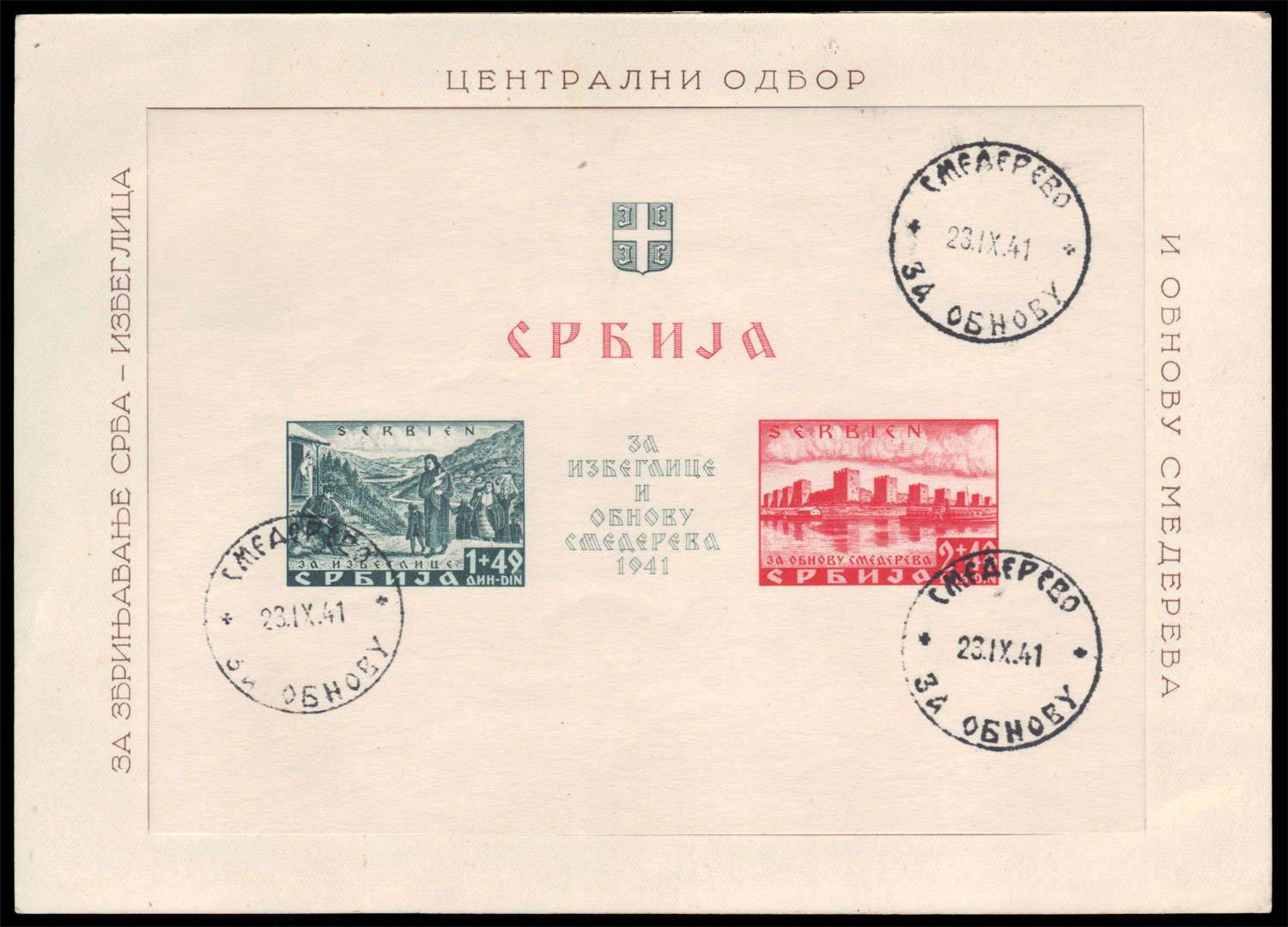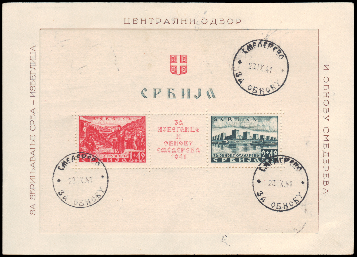 Serbia (okupacja niemiecka)- wydanie z dopłatą na odbudowę historycznego zamku Smederevo zniszczonego w wyniku katastrofalnej eksplozji składowanej przez Niemców amunicji. Bloki ząbkowany i cięty, skasowane okolicznościowo w pierwszym dniu obiegu, na specjalnych kartach FDC.