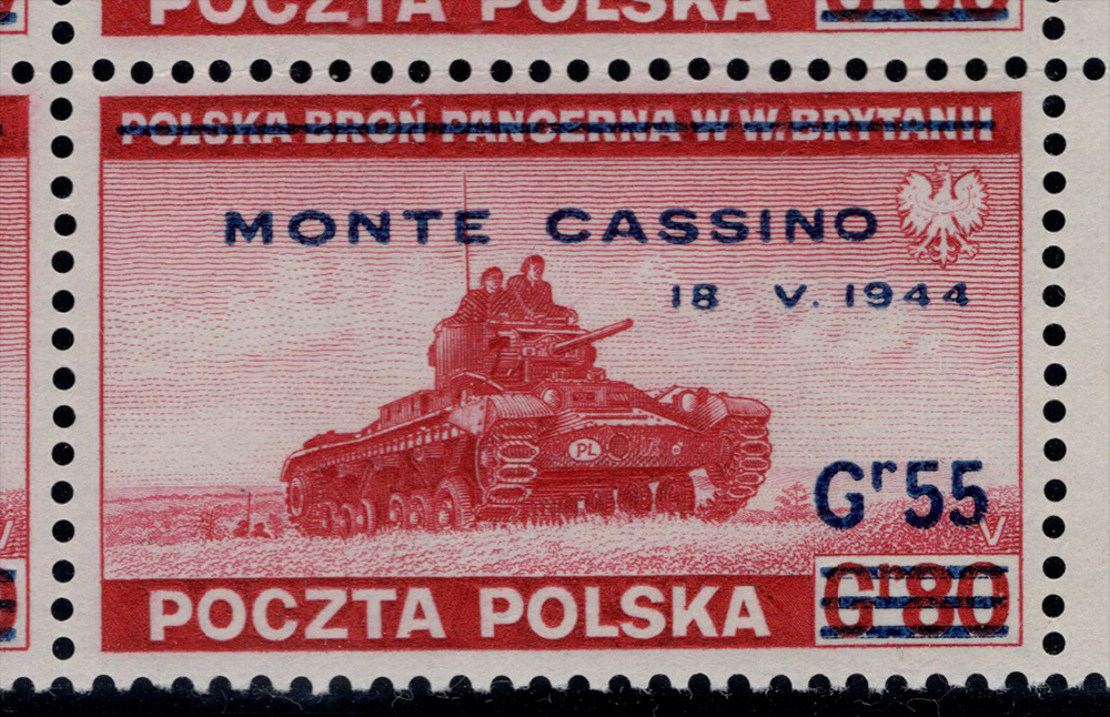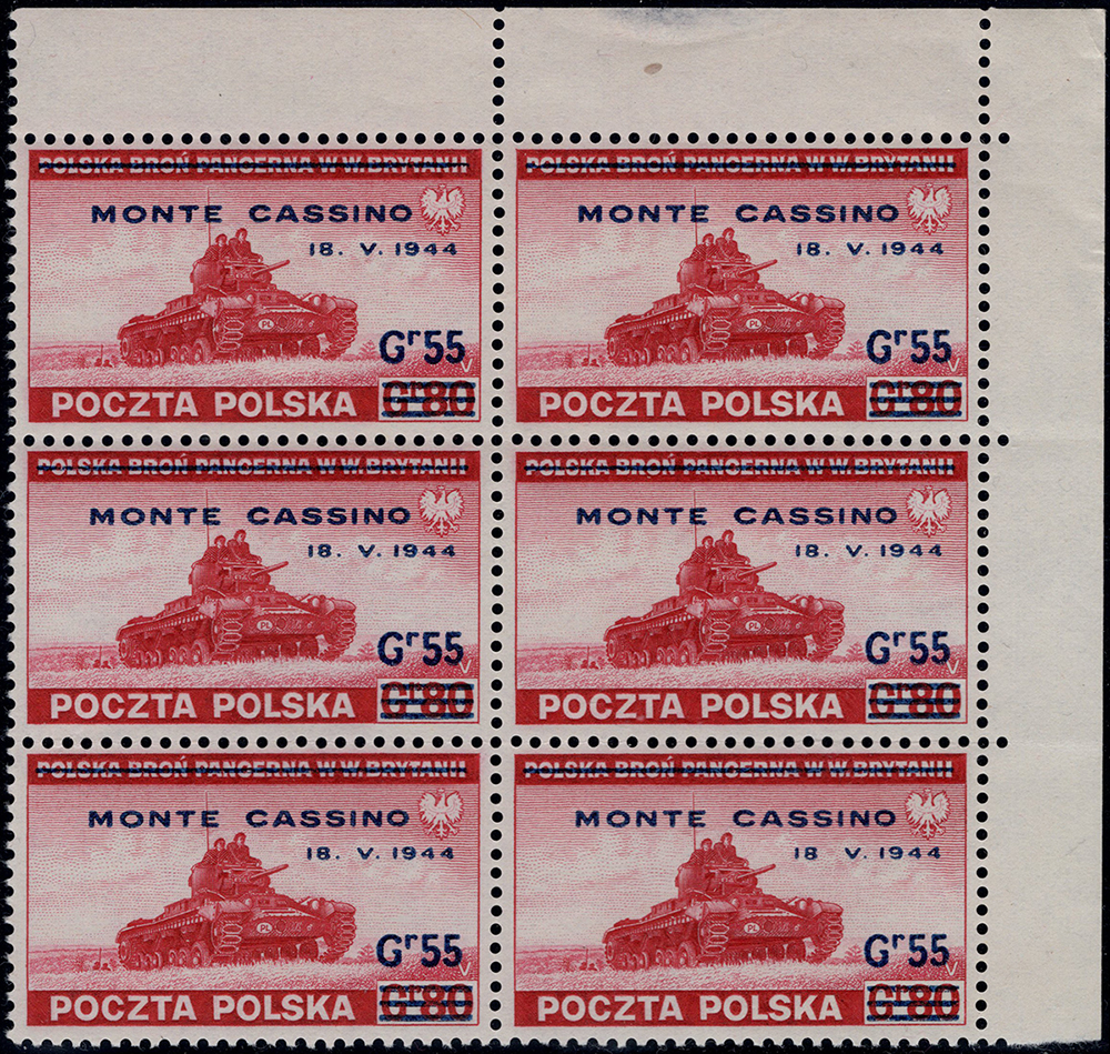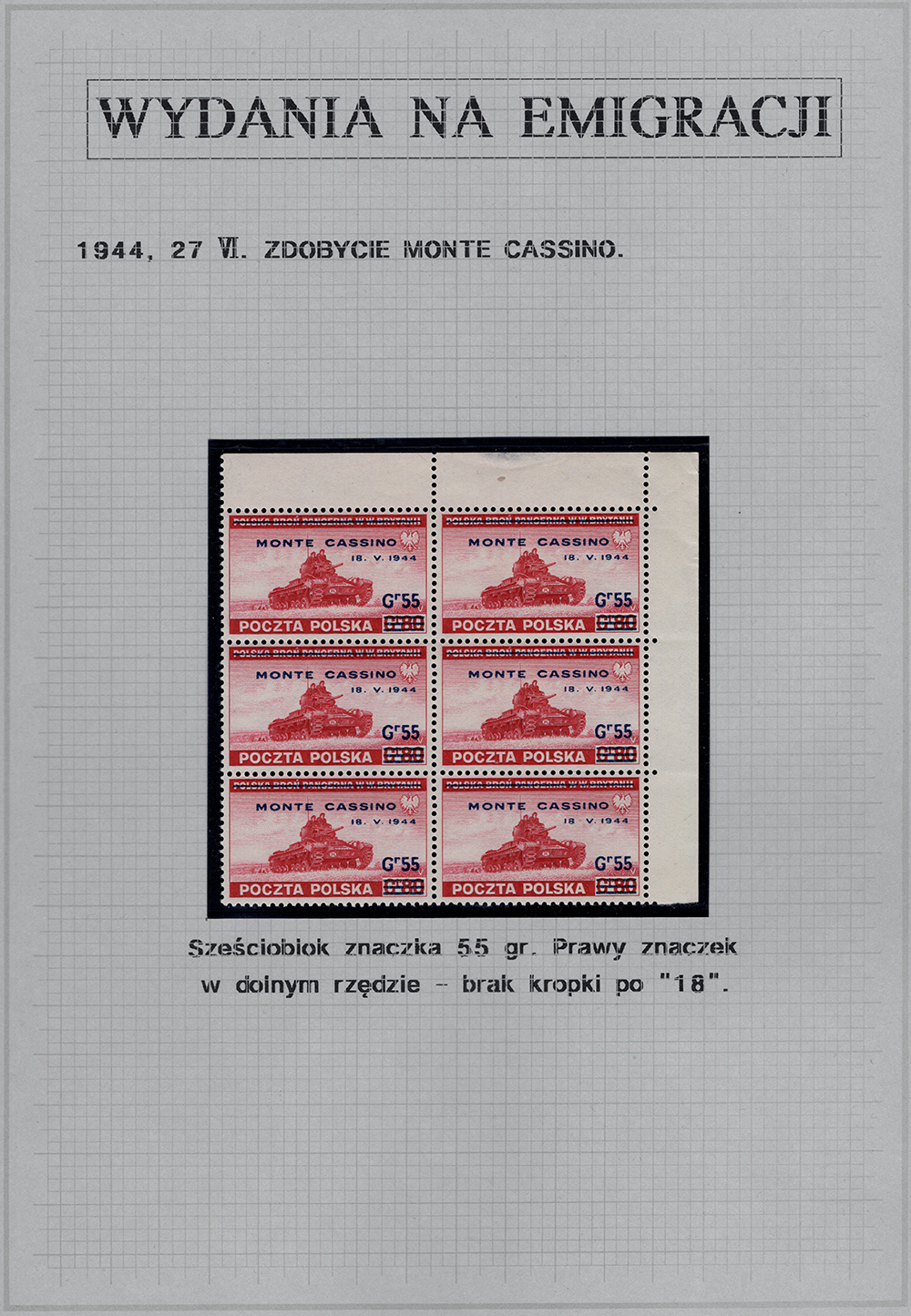 Wydania rządu na emigracji tzw."Wydania londyńskie". Narożny sześcioblok znaczków za 55/80 gr. Lewy dolny znaczek z błędem nadruku na poz.30 "brak kropki po 18". Wycena katalogowa sześciobloku z błędem Fi.735.- (sam znaczek z błędem Fi.160.-). Całość na karcie wystawowej z kolekcji zbudowanej przez wybitnego kolekcjonera znaczków i całości pocztowych Polski z lat 1860-1960 Krzysztofa Trokenheima.