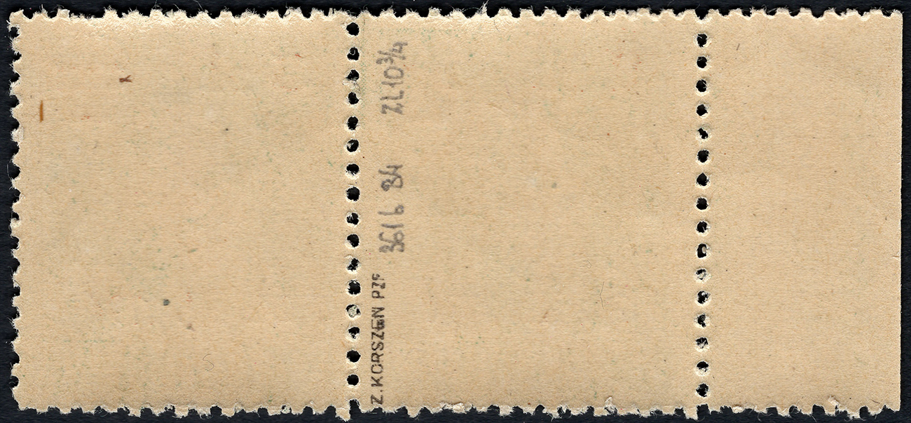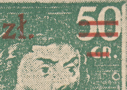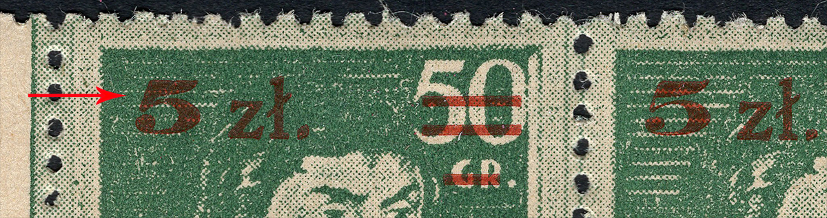 151. rocznica Powstania Kościuszkowskiego. Parka znaczków za 5 zł./50 gr. w barwie zielonej z katalogowanymi błędami. Znaczek marginesowy z błędem na poz.21 "gruby łącznik w 5", a znaczek po prawej z błędami na znaczku podstawowym z poz.22 "plamka pod zł" i nadruku "ścięta kropka po zł"