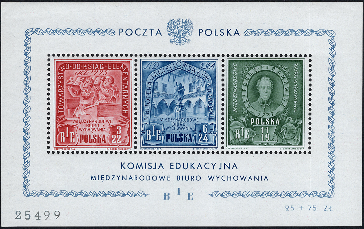 Komisja Edukacji Narodowej. Czysty blok za 25+75 zł z szaroczarnym numerem. Dużo rzadszy wśród tak wysokich numeratorów (25499). Fi. 2200.-
