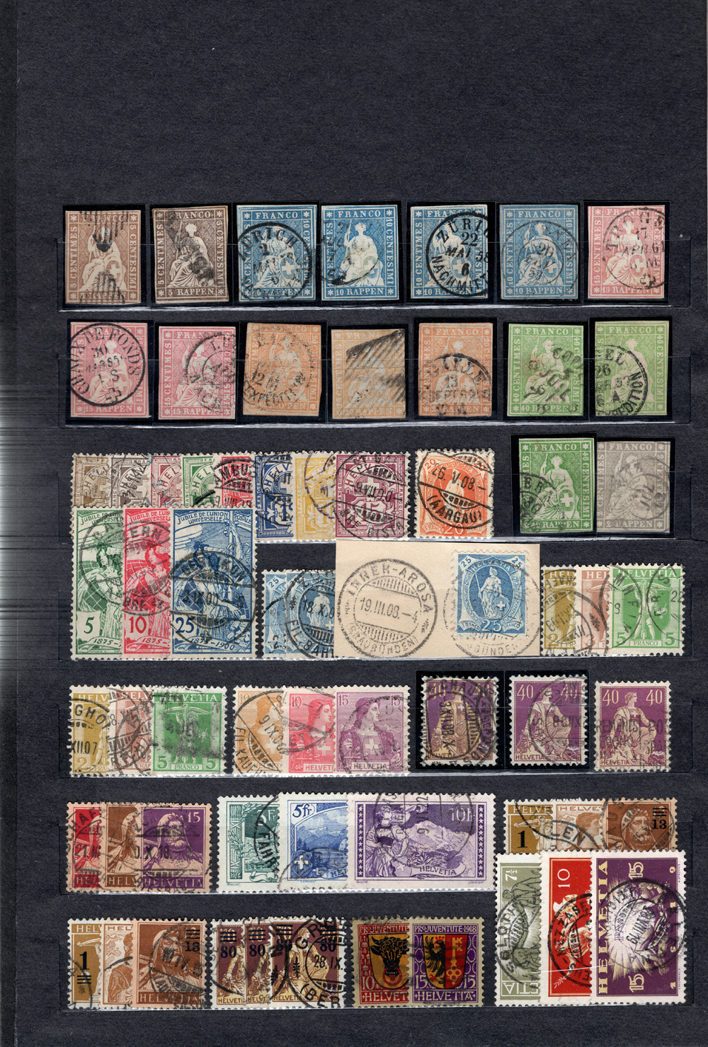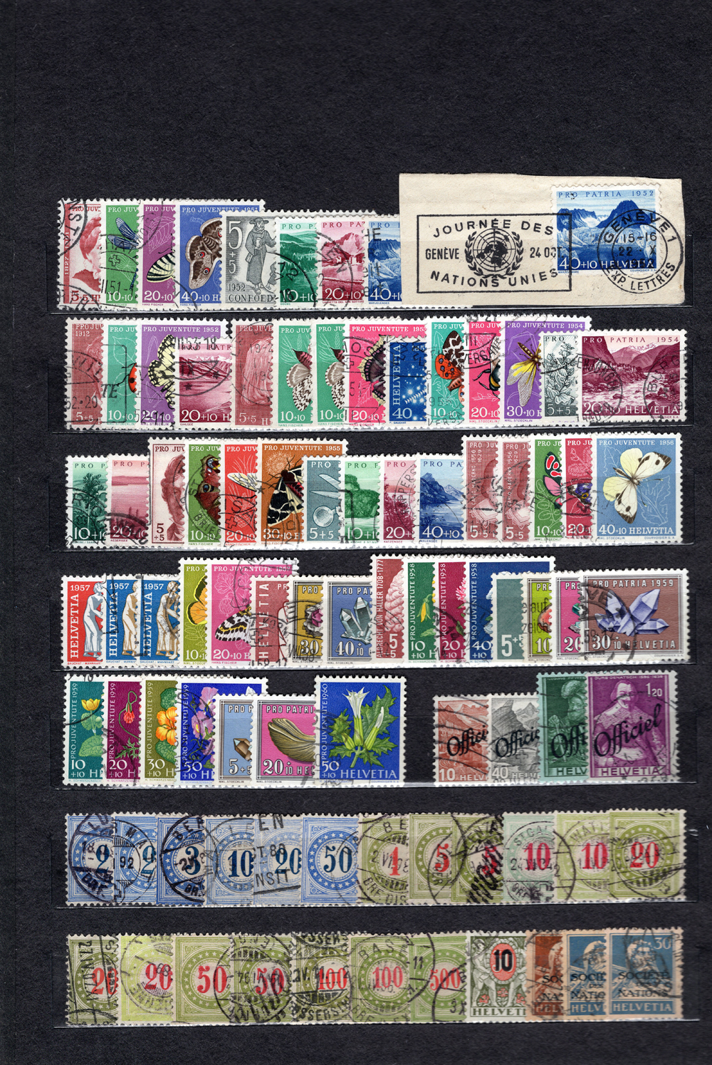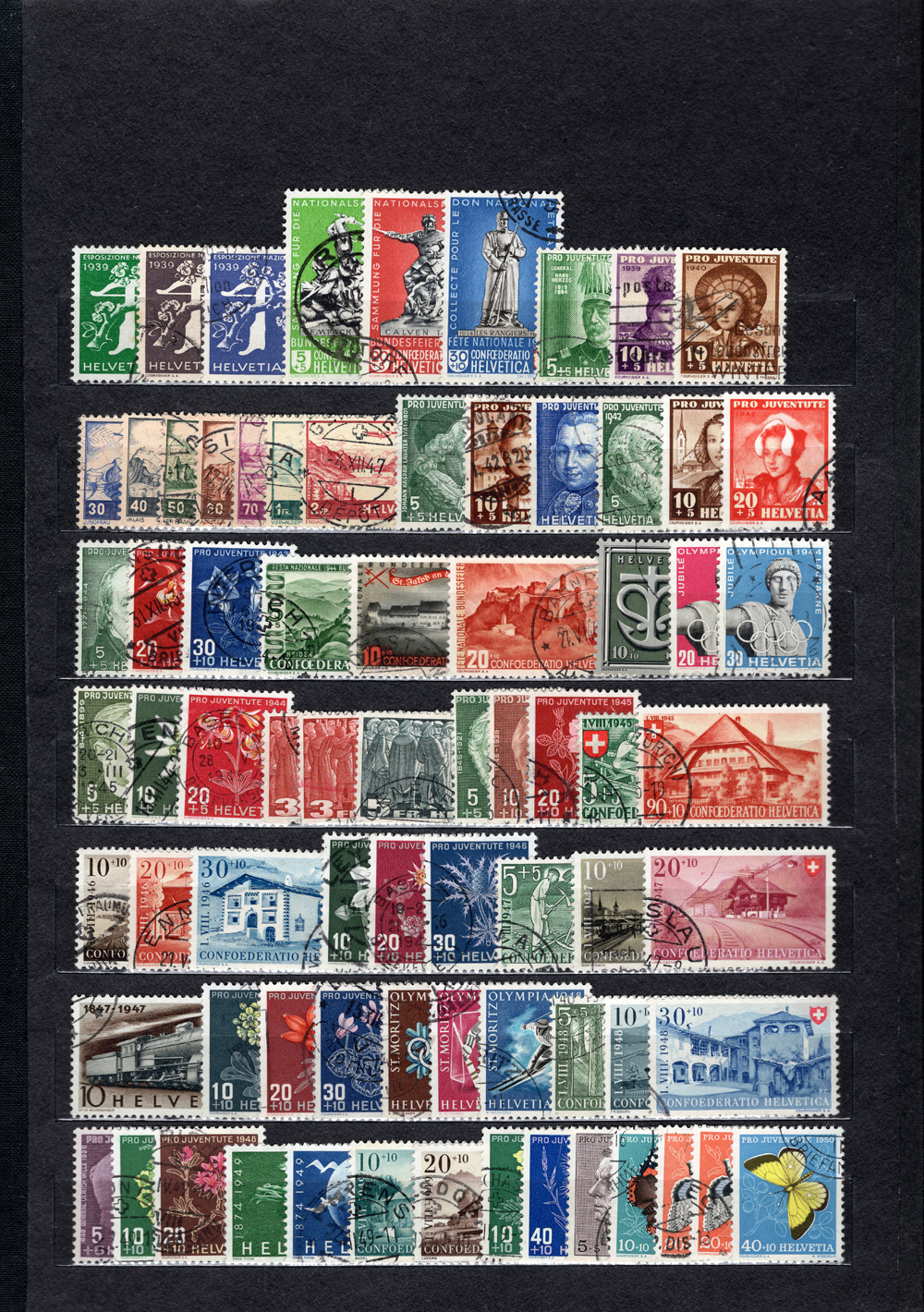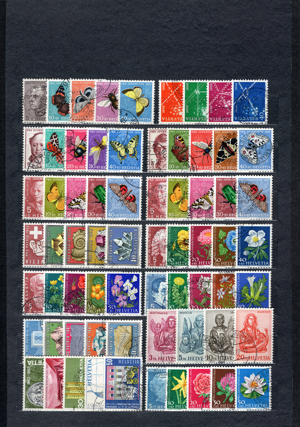SZWAJCARIA. Zestaw znaczków kasowanych z lat 1854-1971. Starannie dobrane serie z czytelnymi w większości kasownikami. Jedynie datownik na znaczku 152, który został prawdopodobnie odklejony z okolicznościowej koperty, miał datę odbitą na tej kopercie. Zestaw zawiera dodatkowo kilka listów, ozdobnych kartek i kopert FDC.