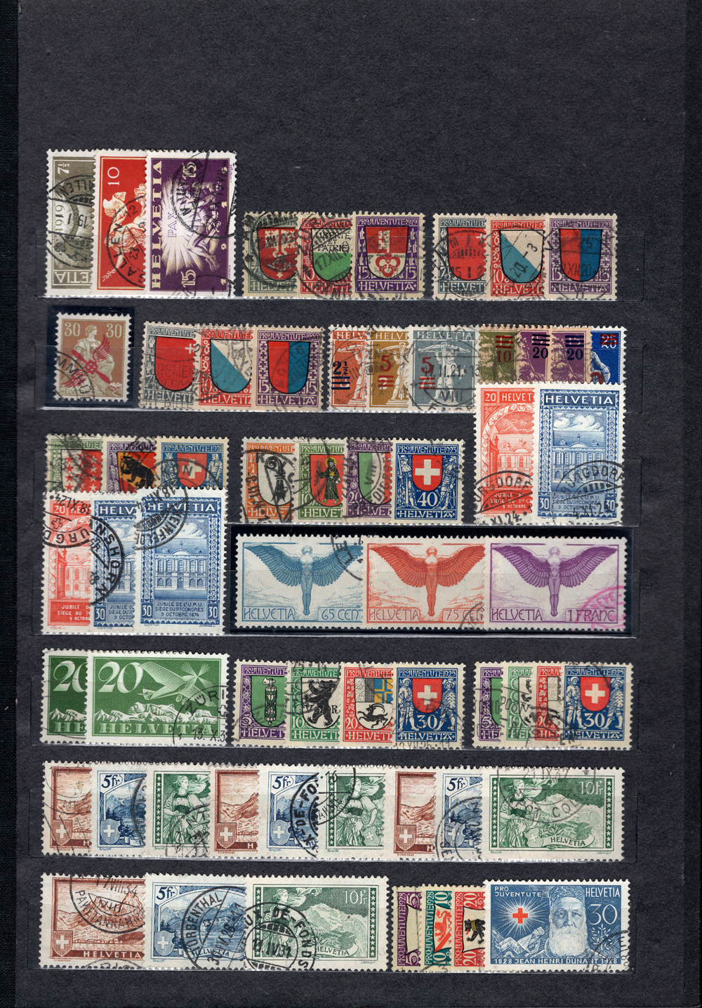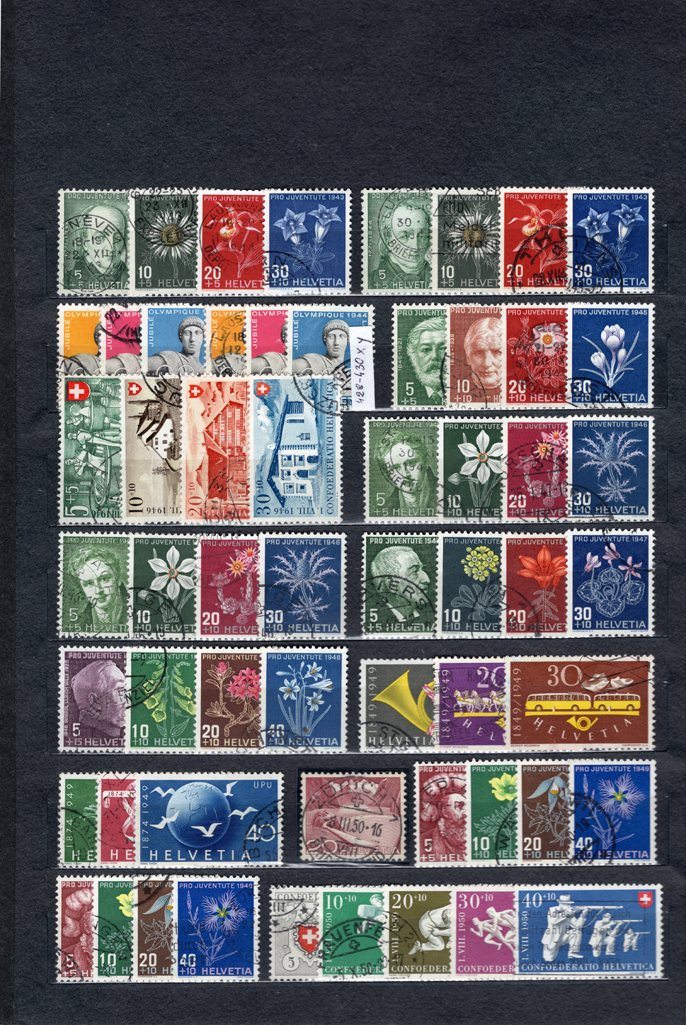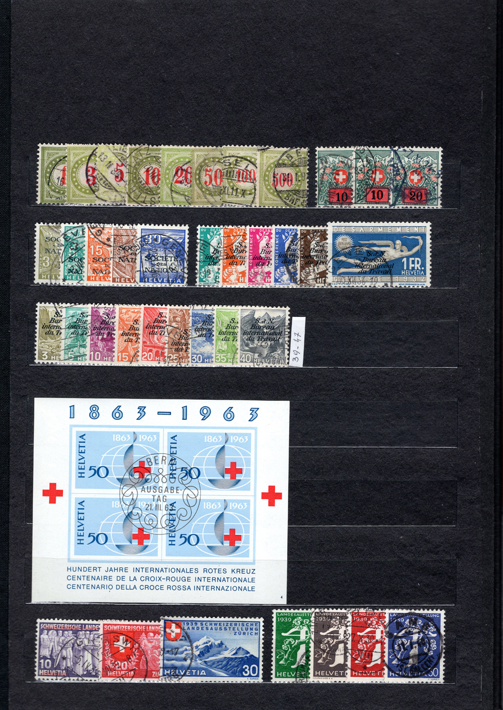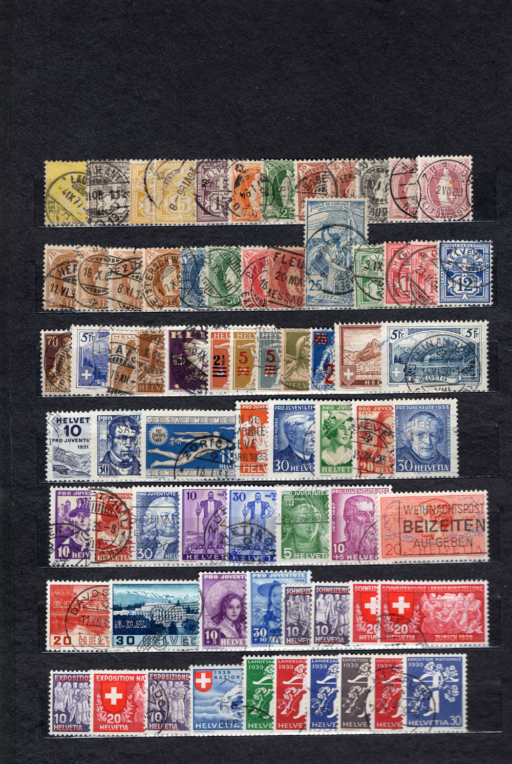 SZWAJCARIA. Zestaw znaczków kasowanych z lat 1854-1971. Starannie dobrane serie z czytelnymi w większości kasownikami. Jedynie datownik na znaczku 152, który został prawdopodobnie odklejony z okolicznościowej koperty, miał datę odbitą na tej kopercie. Zestaw zawiera dodatkowo kilka listów, ozdobnych kartek i kopert FDC.